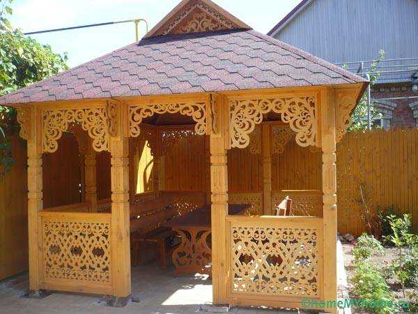 - Также сейчас популярна резьба по дереву. Изысканные рельефные рисунки станут своеобразным декором беседки.