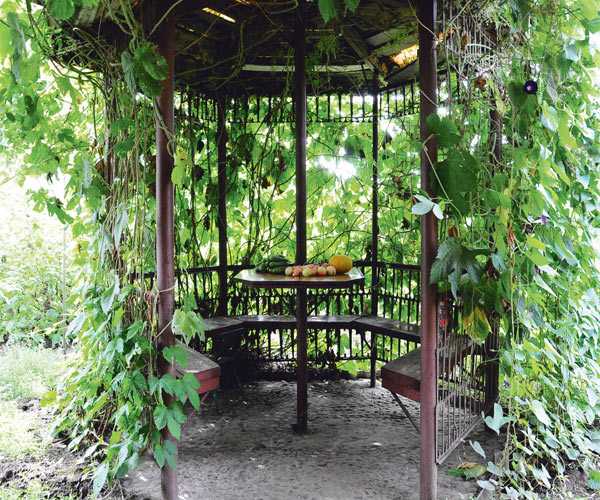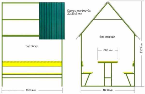 Различных схем и конструкций обустройства столько же, сколько самих дачников, каждый искал наиболее удобный и простой вариант, чтобы места под крышей хватало, и одновременно беседка не занимала пол-участка.