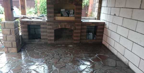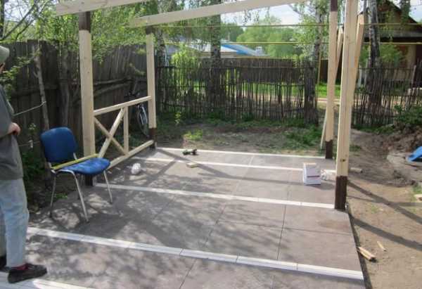 - Выполните укладку керамической плитки на основании бетона. Желательно, чтобы кафель не боялся мороза, ведь эксплуатировать беседку вы будете круглый год.