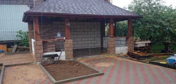 Перед обустройством столбчатого фундамента первоначально удаляют дерн, засыпают слоем мокрого песка и утрамбовывают площадку под будущую беседку. Далее размечают положение бетонных свай, вырывается котлован под каждую ногу на глубину не менее 50 см. На дно отсыпают слой щебня, трамбуют, далее — песок, укладывается рубероидная изоляция, устанавливаются доски опалубки из досок 300х300 см, высотой 170-200 мм. После заливки бетоном по центру опалубки закладывают анкерные болты или куски арматуры, к которым будет привязываться каркас будущей беседки. Пока бетон не застыл окончательно, через 5-6 часов с помощью длинной рейки строительного уровня подрезаем опоры на одном уровне.