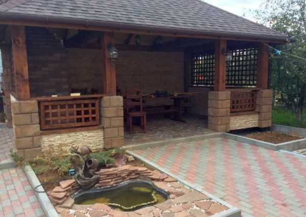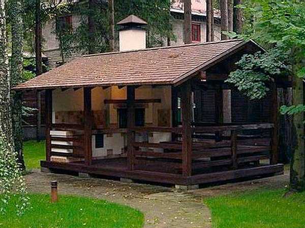 Предлагаем соорудить деревянную беседку с мангалом, но делать это нужно на приличном расстоянии от жилого дома. Так дым не будет попадать в окна, а если кто-то из гостей устанет от шума, он сможет насладиться тихим отдыхом в помещении. С эстетической точки зрения это тоже хорошо: беседка не будет стоять под окном, как «истукан».