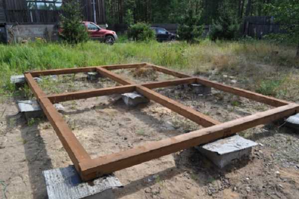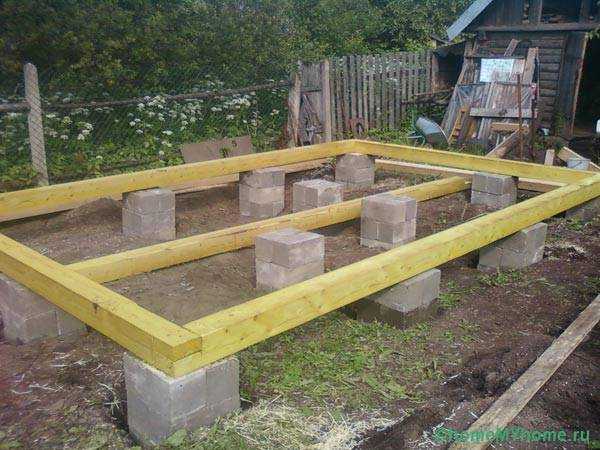 Конструкция получается простой, а установка быстрой. Планируете ее эксплуатацию не только летом, но и зимой? В таком случае, фундамент желательно сделать столбчатым. На него устанавливаются лаги из бруса диаметром 5 на 10 см, после чего настилается пол.