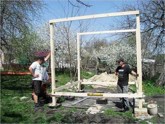 Каждый брусовый столб при установке выравнивают по строительному уровню, минимум в двух вертикальных плоскостях, после чего осторожно фиксируют набивкой досок — боковых подкосов. Установленные столбы связывают поперечными балками. Чтобы увеличить жесткость каркаса, низ постройки зашивают сначала в черновую горбылем, а затем выравнивают и набивают самые ровные и качественные доски из отобранного запаса.
