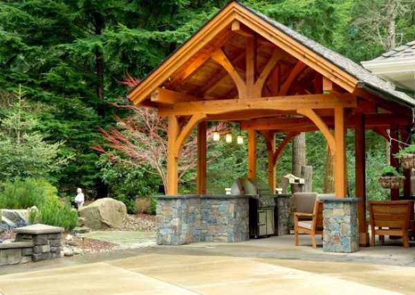Форма деревянных элементов может быть самой разнообразной: сегодня в моде беседки с мангалом из бруса, срезов дерева, досок и т.д.