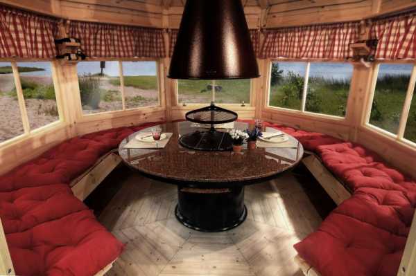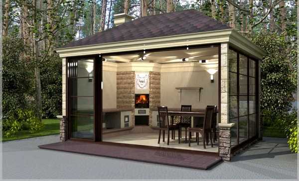 Застекленные беседки с мангалом и барбекю, фотоВариации печи для внутреннего оснащения