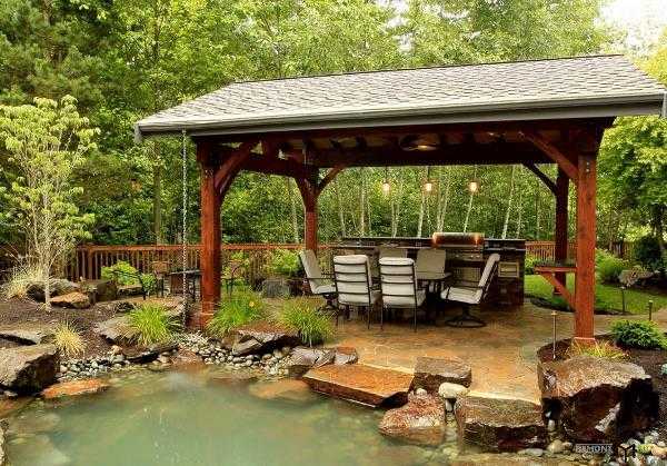 Красивое оформление постройкиЕсли на участке есть красивые клумбы, альпийские горки или пруд, то павильон необходимо расположить поблизости. Если постройка располагается рядом с основным зданием, то для ее кровли стоит использовать такое же покрытие, как для основного здания. Этом поможет создать единый стиль в архитектурном ансамбле.