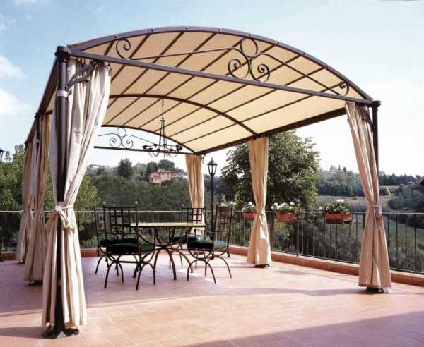 - средиземноморский стиль – максимально простой и лаконичный. В таких беседках используйте дерево без вычурного декора. Допускается простая геометрия, парусные легкие занавески и другие аккуратные детали;