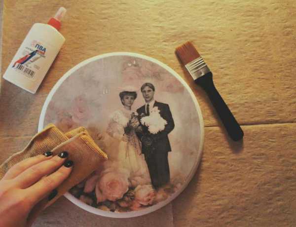 - Тщательно разглаживаем поверхность, выгоняем пузырьки воздуха, устраняем лишний клей. Работать нужно очень аккуратно, поскольку есть риск повредить фото.