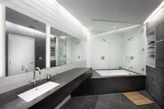 Самые фешенебельные и просторные ванные комнаты, которые сделаны в черно-белом стиле и имеют комбинированное освещение, вместе с достаточной естественной вентиляцией они являются украшением дома.