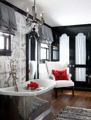 Дизайн ванной в черно-белых тонах не всегда означает современный стиль или мужскую обитель. Черные стены и белые двери, мебель, сантехника хорошо уживаются с такими женскими штучками, как изящная люстра, тканевые шторы вокруг ванной и обилие цветов.