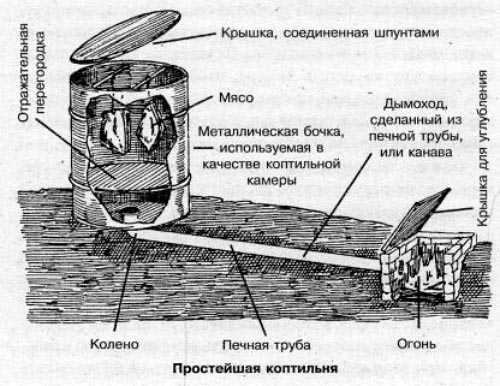 Чертеж самого простого стационарного устройства наглядно демонстрирует его простоту и возможность сделать своими руками. По большому счету — это источник огня (небольшая печка), спрятанная в землю труба, по которой будет идти дым и камера для копчения, находящаяся на втором конце этой трубы, уровнем немного выше печки. Камерой может служить как бочка без дна, так и импровизированный домик.