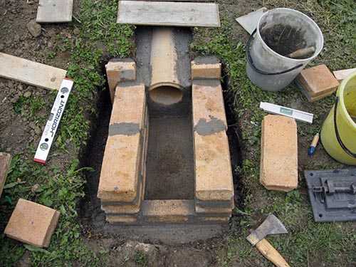 Топочная камера выкладывается из кирпича на глубине пролегания дымохода. После строительства стенки конструкции присыпаются землей. Крышка топки должна располагаться над уровнем земли