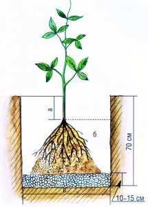 В лунку или траншею, глубиной от 50 см. кладут дренаж слоем в 12-17 см.