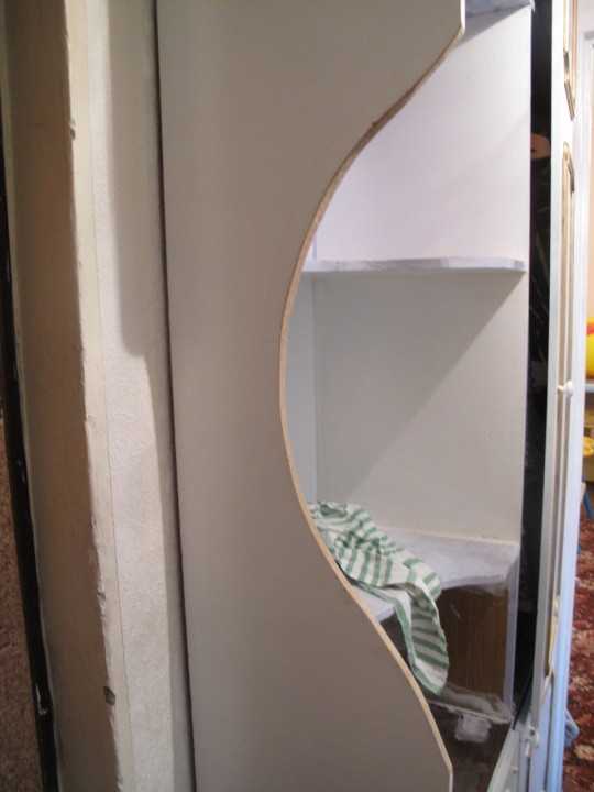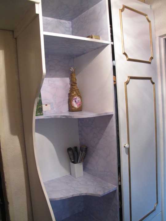 Левый верхний край у самой двери решила заполнить дополнительной антресолью. Замерила все размеры, выпилила из подарочных остатков мебели нужные детали,собрала антресоль,выкрасила в белый цвет…