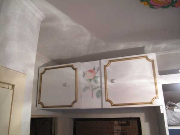 Добавила винтажный декупаж»Роза»и покрыла лаком.После просушки повесила с помощью дочери антресоль на её место.Этим временем у меня высохли после покраски дверцы и я вырезала для них фигурки и вкрутила новые ручки. К дверцам добавила магнитики, для плотного прилегания.