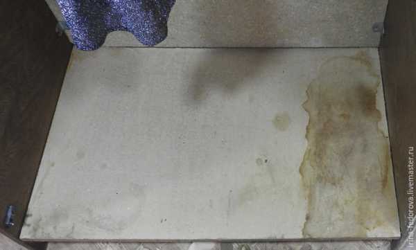 2. Прошкурить все поверхности, которые вы собираетесь перекрашивать. У меня мебель была из шпона, покрытая лаком, а дно, я так поняла, из прессованной листовой бумаги. Когда я его мыла, естественно, дно намокло и начало расслаиваться. Я соскоблила верхние слои этого дна (бумаги) и оставила просушиваться. Шлиф-машинки у меня нет, и поэтому я лак сняла не полностью. Конечно, шлиф-машинка облегчила бы эту работу, но нет, так нет. После шлифовки всю пыль нужно убрать щеткой и протереть влажной тряпкой. К следующему действию нужно переходить, когда все высохнет. У меня на мебели были сколы, я их замазала шпатлевкой, когда шпатлевка высохла, сравняла ее с поверхностью наждачкой.