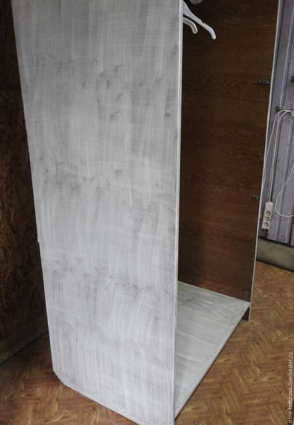 Весь шифоньер выкрасила в белый цвет акриловой краской на три раза с просушкой,затем-лаком акриловым,как обычно… Спиленные края зашкурила,загрунтовала,снова шкурила и покрыла краской белой.
