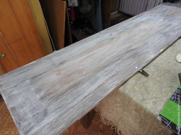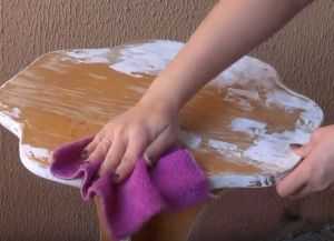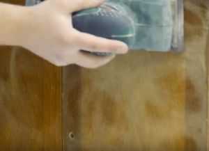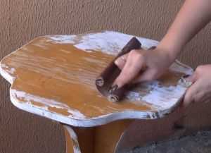 - Старый столик ошкуривается вручную наждачной бумагой.