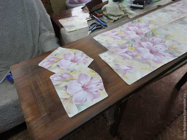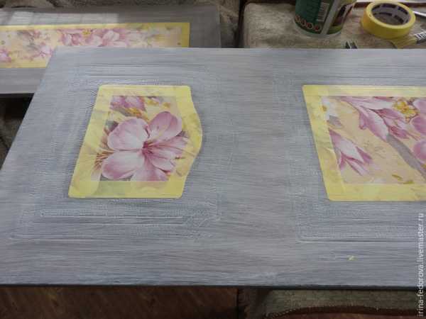 - Приклеивание подготовленных рисунков. Когда деталь большая, прикладывать ее начинают от края, приглаживая и выравнивая сухой кистью;