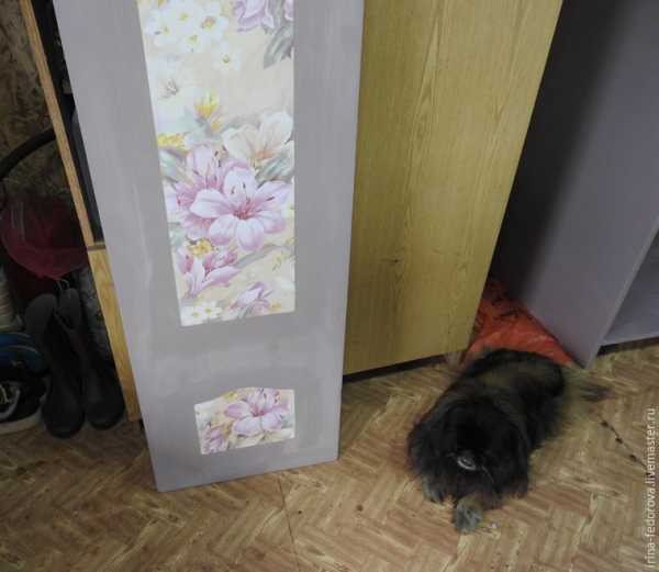 5. Намажьте обильно клеем ПВА вырезанные мотивы и те места, куда их собираетесь приклеить. Подождите минуты две и приклейте их. Я разравнивала маленьким роликом, им очень удобно выгонять воздух из под обоев. Поставила на просушку до следующего утра.