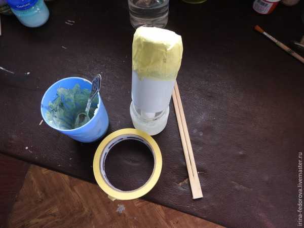 10. На этом этапе мы будем наносить ободок-контур. Для этого мы берем тюбик от клея ПВА с узким носиком и разрезаем у него дно (можно любой другой, например, от краски для волос и т. д.). Берем небольшую емкость, выкладываем в нее шпатлевку, клей ПВА и колер, все это перемешиваем до однородного состояния, должна получиться консистенция густой сметаны. Дальше, берем ложечку и начинаем эту массу складывать в приготовленный тюбик. Дно заматываем малярным скотчем. У этого тюбика отодвигается носик, что очень удобно. Выдвинул его, поработал и снова задвинул. Ничего не течет и не засыхает.
