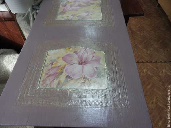 6. Развела белую акриловую краску, смешав ее с разными колерами. Получила очень красивый лиловый цвет. Начала покраску всех частей шкафа, которые запланировала покрасить. Выкрасила: дверцы, внешние боковые торцы и внутреннее дно шкафа и стала ждать, когда все просохнет. Я окрашивала краской на 2 слоя, с промежуточной сушкой каждого слоя.