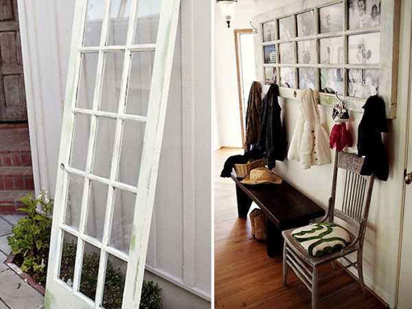 - Немного потрудившись, дверь можно превратить в интерьерную фишку для прихожей — вешалку с рамками для фотографий.