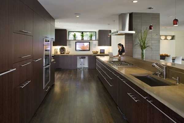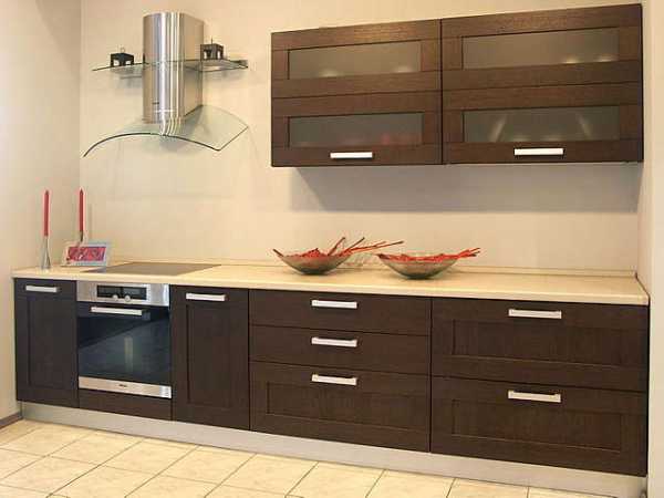 Сейчас мебель делают из различных современных материалов. Популярны МДФ и ДСП. Благодаря этим материалам, производители с успехом имитируют любой вид древесины. Венге — строгий. Изысканный и в то же время простой оттенок. Он придаст кухонному гарнитуру ухоженности и аристократизма. Если вы приобрели такую мебель на кухню, то стены оформляйте в песочном, молочном или светлом бежевом — отличное сочетание.