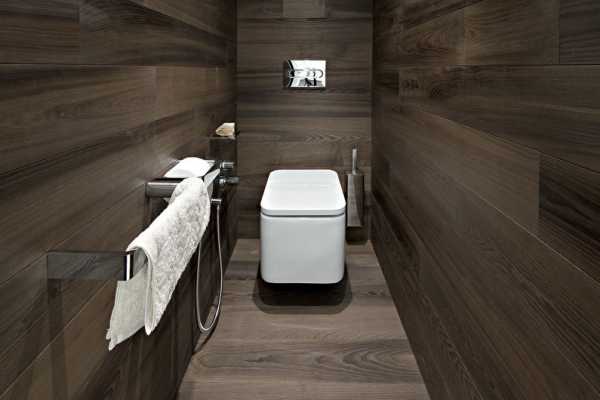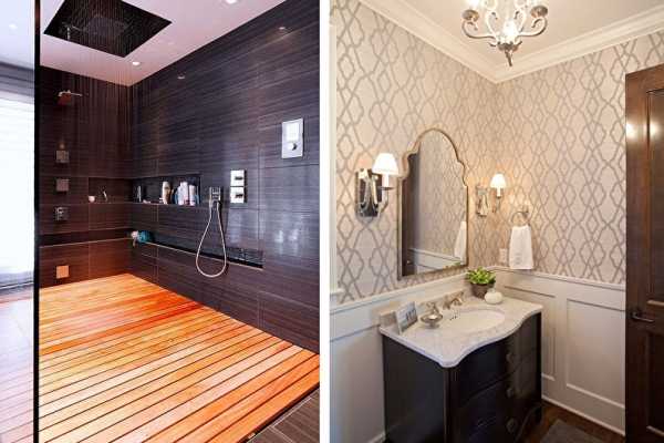 Обычно размещение натуральных покрытий в ванной вызывают беспокойство о долговечности такого решения. Постоянная влажность и пар негативно влияют даже на некоторые искусственные аналоги, но здесь венге проявил себя как нельзя лучше. Некоторые хозяева облицовывают стены панелями из древесины, оформляя зону душа.