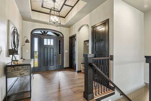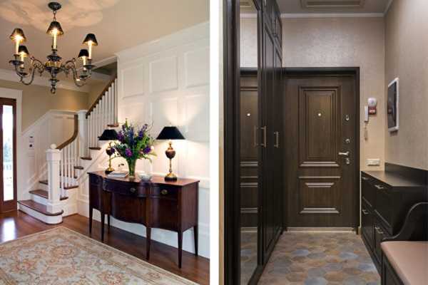 В более просторных холлах гармонично смотрятся деревянные гардеробные, комоды, полки, скамьи и другие атрибуты. При наличии второго этажа можно соорудить лестницу, не переживая о ее надежности — материал способен выдержать высокие нагрузки.