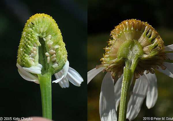 Ещё более однозначное отличие: отсутствие полости внутри цветоложа. На фото ниже слева — разрезанное соцветие ромашки аптечной, а справа — ромашника непахучего: