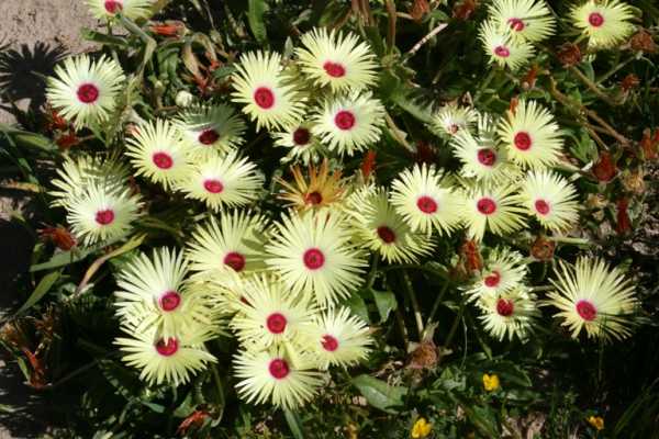 У этого трудновыговариваемого растения есть и несколько других, более запоминающихся названий: солнышко, ледяная травка, полуденник, так как его соцветия раскрываются только днем и в ясную погоду. Самым распространенным является название «хрустальная ромашка». И неудивительно, ее узкие лепестки во время тумана или дождя накапливают на себе множество каплей росы, что со стороны выглядят как горный хрусталь. Растет на солнечных и сухих участках, засуху легко переносит. Их утолщенные стебли, высотой не больше тридцати сантиметров могут либо тянуться кверху, либо расстилаться по земле. Помимо разноцветных лепестков, способных удерживать на себе росу, у этого цветка и листочки, благодаря особому строению и наличию соков, блестят на солнце как кристаллики.