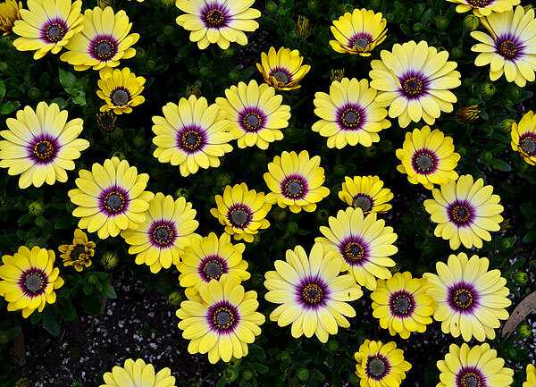 Встречаются также эти растения с различными узорами на краевых цветах. Например, так выглядит остеоспермум с желтой окантовкой и сиреневыми основаниями язычковых цветков: