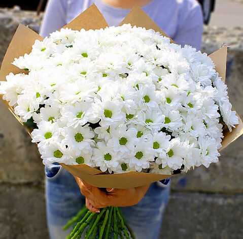 Благодаря тому, что стебли и цветоносы хризантем достаточно высокие, их и продают в качестве подарочных цветов — они хорошо смотрятся в букетной композиции, обычно в качестве фона.