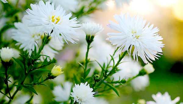 Самые распространенные сорта астр: белая Альба, светло-лиловый Голиаф, темно-фиолетовый Дункле Шене, розово-красный Рубер.