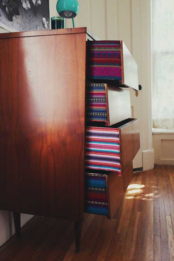 Красивая ткань способна изменить старый шкаф до неузнаваемости. К тому же, креативный предмет мебели непременно обратит на себя внимание ваших гостей. Стоит помнить лишь о том, что наиболее удачным вариантом для декора шкафа будет ткань, которая гармонирует с интерьером.