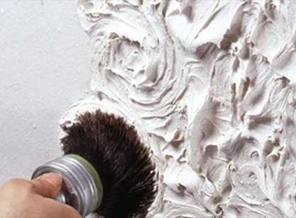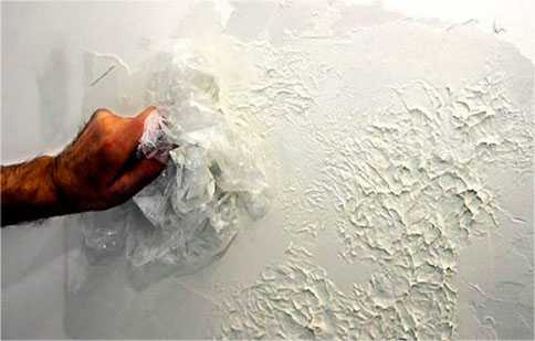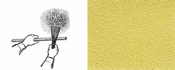 Самый простой метод придания рельефности практически любому типу декоративной штукатурки. Суть его достаточно проста: новый раствор разбрызгивается по предыдущему, уже успевшему набрать прочность. В зависимости от желаемого эффекта, которого вы хотите добиться для своих стен, выбирается инструмент для нанесения. Чтобы получить мелкозернистый рельеф чаще всего используют простой веник, а вот для крупного необходима сетка.