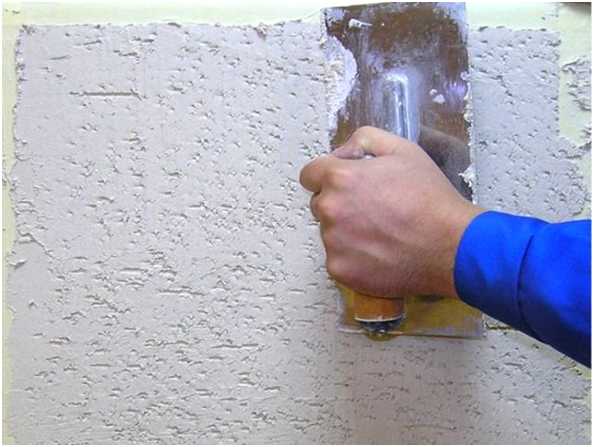 Положите небольшое количество массы на шпатель и медленно проведите по поверхности стены до тех пор, пока гранулы не начнут оставлять после себя следы. Еще невысохший отделочный материал можно потереть пластиковой теркой, но только силу применять в этом деле не следует.