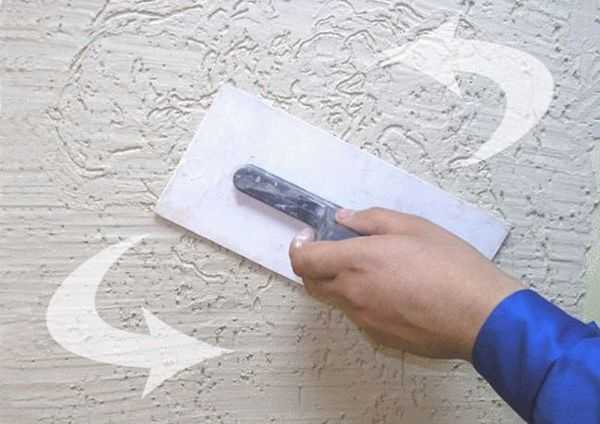 Нанесение структурной штукатуркиДалее пластмассовой кельмой обрабатывают всю площадь стены. Движения могут быть направлены в одну сторону, хаотичными или круговыми. Твердые гранулы, находящиеся в составе структурных штукатурок, создадут борозды, которые после высыхания станут неровными и будут похожи на текстуру естественных материалов.