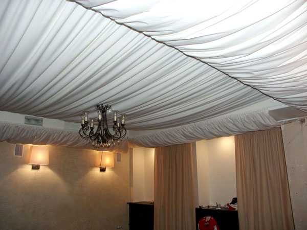 Отделка потолка текстилем – модная новинка, которая приобрела широкую популярность. В качестве материала можно использовать: