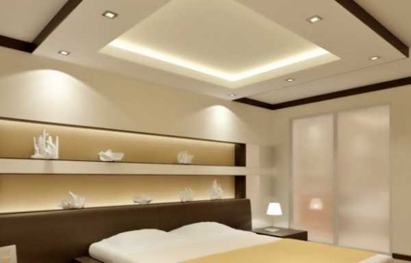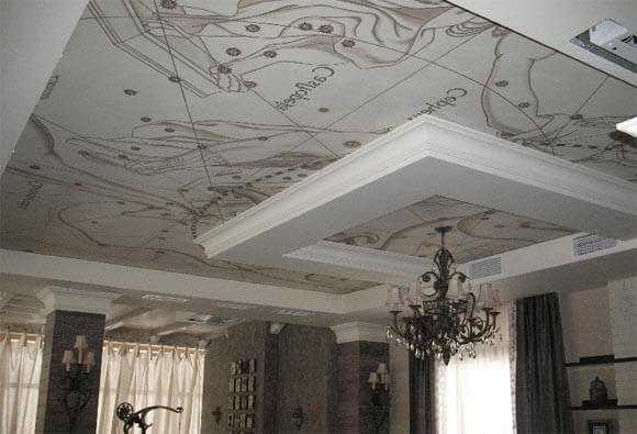 Красиво и оригинально оформить потолок можно ступенчатой конструкцией. Для этого по намеченному на потолке контуру при помощи металлических профилей создается каркас, потом выполняется обшивка потолка гипсокартоном. Зашпаклеванный и покрашенный подвесной потолок с правильно подобранными встроенными светильниками будет отлично смотреться. Если же дополнить такой декор потолка тканью, подходящей по цвету и фактуре, можно получить совершенно эксклюзивный интерьер, отвечающий самому требовательному вкусу любого эстета.