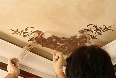 - Художественная роспись. Этот вид декора дает возможность любому проявить в полной мере талант художника. Даже если вы не очень хорошо умеете рисовать, то уж использовать различные трафареты для декора потолка под силу каждому. Выбранный трафарет крепится при помощи строительного скотча к потолку и раскрашивается обычными красками.