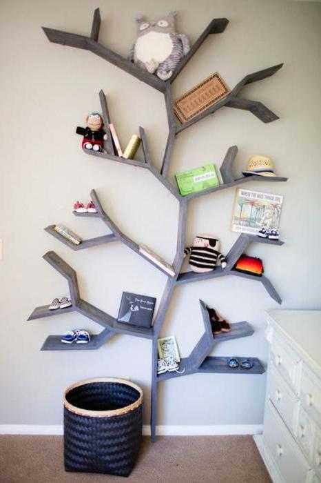 В детской более уместна будет книжная полка в виде дерева, с низкими полками, чтобы дети могли легко добраться до книг. Это выглядит очень мило, даже немного .