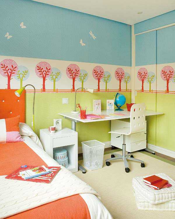 ΠΠ΅ΡΠ²ΠΎΠ΅, ΡΠ΅ΠΌ ΠΏΡΠΈΠ²Π»Π΅ΠΊΠ°Π΅Ρ ΡΠ°ΠΊΠΎΠ΅ ΡΠ΅ΡΠ΅Π½ΠΈΠ΅ Π² Π΄Π΅ΡΡΠΊΠΎΠΉ ΠΊΠΎΠΌΠ½Π°ΡΠ΅ β ΡΡΠΎ ΡΠ½ΠΈΠ²Π΅ΡΡΠ°Π»ΡΠ½ΠΎΡΡΡ Π΄Π°Π½Π½ΠΎΠ³ΠΎ ΡΠ²Π΅ΡΠΎΠ²ΠΎΠ³ΠΎ ΡΠ΅ΡΠ΅Π½ΠΈΡ, ΡΠ°ΠΊΠ°Ρ ΠΊΠΎΠΌΠ½Π°ΡΠ° ΠΏΠΎΠ΄ΠΎΠΉΠ΄Π΅Ρ ΠΊΠ°ΠΊ Π΄Π΅Π²ΠΎΡΠΊΠ΅, ΡΠ°ΠΊ ΠΈ ΠΌΠ°Π»ΡΡΠΈΠΊΡ. ΠΡΠ±ΠΎΡ ΡΠ²Π΅ΡΠ° Π² Π΄Π΅ΡΡΠΊΠΎΠΉ ΠΊΠΎΠΌΠ½Π°ΡΠ΅ Π²Π΅ΡΡΠΌΠ° Π²Π°ΠΆΠ΅Π½, Π½Π°ΠΏΡΠΈΠΌΠ΅Ρ, Π°Π³ΡΠ΅ΡΡΠΈΠ²Π½ΠΎ ΡΡΠΊΠΈΠ΅ ΡΠ²Π΅ΡΠ° (ΠΌΠ½ΠΎΠ³ΠΎ ΠΊΡΠ°ΡΠ½ΠΎΠ³ΠΎ ΠΈΠ»ΠΈ ΠΎΡΠ°Π½ΠΆΠ΅Π²ΠΎΠ³ΠΎ), ΡΠΏΠΎΡΠΎΠ±Π½Ρ ΡΡΠ°ΡΠ°ΡΡ ΠΊΡΠΎΠ²ΠΎΠΎΠ±ΡΠ°ΡΠ΅Π½ΠΈΠ΅ ΠΈ ΡΡΠΈΠ»ΠΈΠ²Π°ΡΡ Π°ΠΊΡΠΈΠ²Π½ΠΎΡΡΡ ΠΈ Π±Π΅Π· ΡΠΎΠ³ΠΎ ΡΠ½Π΅ΡΠ³ΠΈΡΠ½ΡΡ Π΄Π΅ΡΠ΅ΠΉ. ΠΠΎ Π² Π΄Π°Π½Π½ΠΎΠΉ ΠΊΠΎΠΌΠ½Π°ΡΠ΅ ΠΏΡΠΈΠ΄ΡΠ°ΡΡΡΡ Π½Π΅ ΠΊ ΡΠ΅ΠΌΡ β ΠΎΡΠ°Π½ΠΆΠ΅Π²ΡΠΉ, ΠΊΠΎΡΠΎΡΡΠΉ ΠΏΡΠΈΡΡΡΡΡΠ²ΡΠ΅Ρ Π² ΡΠ²Π΅ΡΠΎΠ²ΠΎΠΉ Π³Π°ΠΌΠΌΠ΅, ΡΡΠ°Π²Π½ΠΎΠ²Π΅ΡΠ΅Π½ Π² Π³ΠΎΠ»ΡΠ±ΡΠΌ ΠΈ Π·Π΅Π»Π΅Π½ΡΠΌ ΡΠ²Π΅ΡΠ°ΠΌΠΈ. ΠΠ»Π°Π²Π½ΡΠΌ ΠΏΠΎΠΊΠ°Π·Π°ΡΠ΅Π»Π΅ΠΌ ΡΠΎΠ³ΠΎ, ΡΡΠΎ Π²ΡΠ΅ ΡΠ²Π΅ΡΠ° Π² ΡΠΎΠ²ΠΎΠΊΡΠΏΠ½ΠΎΡΡΠΈ Π²ΡΠ³Π»ΡΠ΄ΡΡ ΠΎΡΠ΅Π½Ρ Π³Π°ΡΠΌΠΎΠ½ΠΈΡΠ½ΠΎ β ΠΆΠΈΠ·Π½Π΅ΡΠ°Π΄ΠΎΡΡΠ½ΠΎΠ΅ Π½Π°ΡΡΡΠΎΠ΅Π½ΠΈΠ΅ Π²ΠΈΡΠ°Π΅Ρ Π² ΠΊΠ°ΠΆΠ΄ΠΎΠΌ ΡΠ³ΠΎΠ»ΠΊΠ΅ ΡΡΠΎΠΉ Π΄Π΅ΡΡΠΊΠΎΠΉ. ΠΠ΅Π½Π°Π²ΡΠ·ΡΠΈΠ²ΡΠΉ ΠΏΡΠΈΡΡΠ½ΡΠΉ ΡΠΈΡΡΠ½ΠΎΠΊ Π½Π°Π½Π΅ΡΠ΅Π½ Π½Π΅ ΡΠΎΠ»ΡΠΊΠΎ Π½Π° ΡΡΠ΅Π½Ρ, Π½ΠΎ ΠΈ Π½Π° ΠΌΠ΅Π±Π΅Π»Ρ.