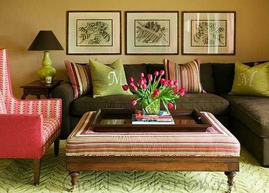 Бежевый диван с пигментом розового или желтого оттенка вызывает противоречия с интерьером гостиной, поэтому будет логично, под ключевые элементы ( стены, окрашенные в желтые или зеленые цвета, шторы, обивка стульев, кресел) подобрать диван с теплым бежевым тоном. То есть, цвета естественных оттенков разбавляем редкими яркими пятнами. Такой подбор будет радовать цветовой продуманностью и декоративностью.