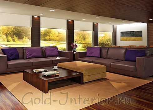 Римские шторы с узорами в цвет мебели сделают комнату теплой и уютной.