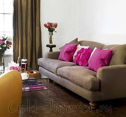 Декоративные подушки сделают интерьер уютным и завершенным. С диваном бежевого оттенка будут хорошо сочетаться подушки любого цвета, начиная от белого или голубого и до коричневого и черного. Цвет и рисунок может перекликаться с другими предметами, например портьеры. Цвет подушек так же может поддерживать тематическую задумку, например синий для морского интерьера или зеленый для эко стиля.