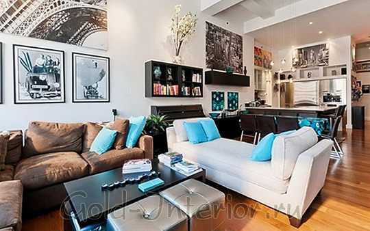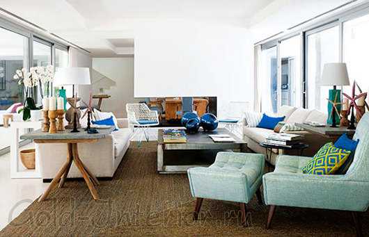 Создать иллюзию присутствия на пляже поможет гамма синих оттенков в интерьере гостиной. В роли песка выступает диван бежевого цвета (расслабляет, успокаивает, снимает стресс), а роль морской воды играют кресла, подушки, шторы и мелкие аксессуары, которые усилят приятный эффект и помогут гармонировать пространство.