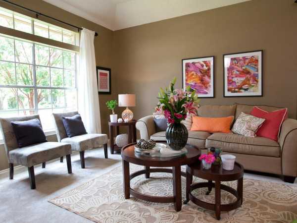 Добавить в интерьер зала настроения, ярких красок так, чтобы комната обрела характер, достаточно окружить теплый диван коралловыми креслами и пуфиками. А несколько маленьких подушек и картина на стене контрастного цвета без сомнения придадут гостиной образ места для релаксации и встреч с друзьями.