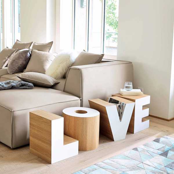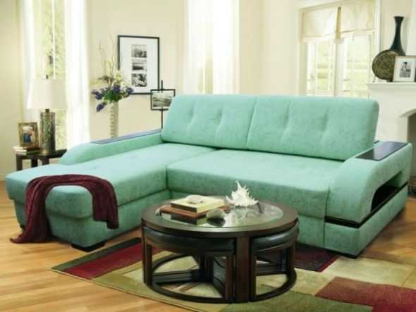 Функциональное оформление создаст дополнительное полезное пространство. Столик может располагаться на подлокотнике или по всей окружности дивана.